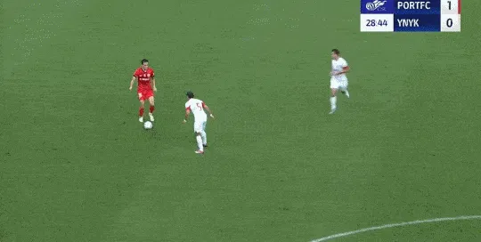 刘若钒直塞禁区,莱昂纳多过掉门将将球打进,海港1-0